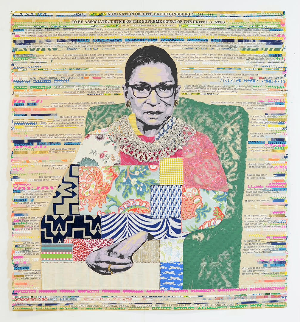 Yellow Blanket's Contribution: Creating and sewing RBG's colorful robe using a variety of upcycled textiles provided by Julie. This marked YB's first of many artist collaborations.